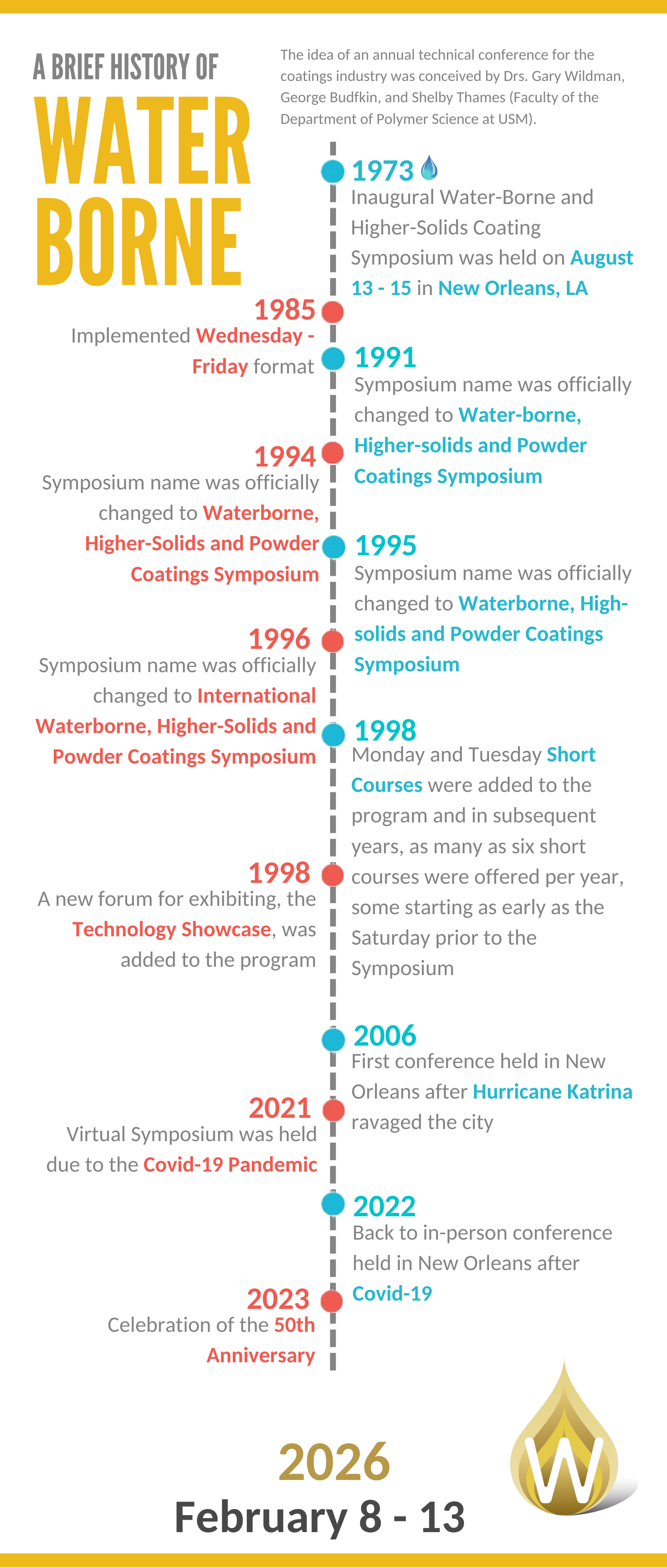The idea of an annual technical conference for the coatings industry was conceived and founded by three faculty members of the Department of Polymer Science at The University of Southern Mississippi (USM): Drs. Gary Wildman, George Bufkin, and Shelby Thames. The results of their efforts—the first “Water-Borne and Higher-Solids Coating Symposium”—was held August 13–15, 1973, in New Orleans, LA and attracted 135 attendees.