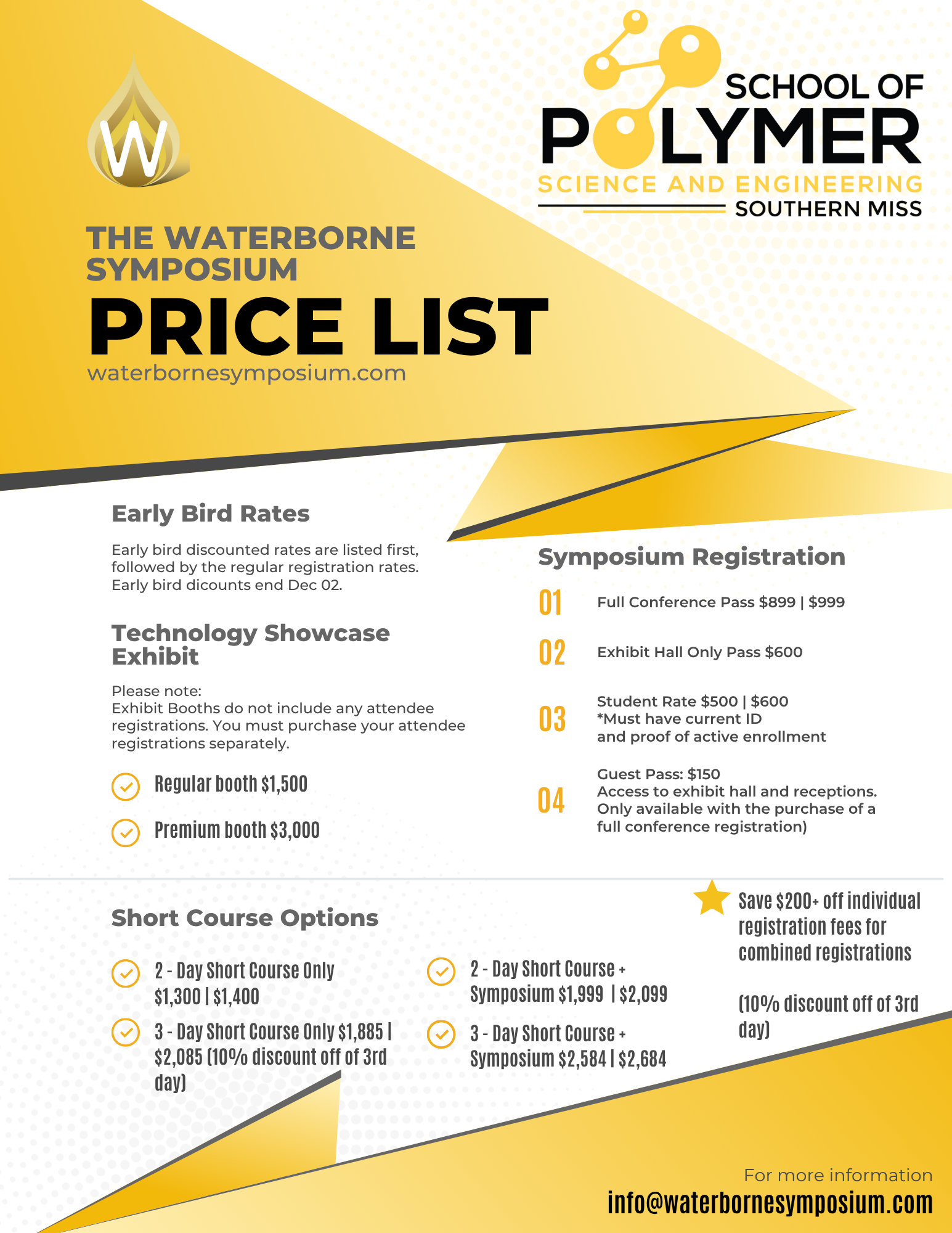 Check the Waterborne Symposium Price List to plan your participation in the 53rd Annual event, February 8–13, 2026, in New Orleans. The list provides detailed registration fees for short courses, technical presentations, and full symposium packages. By reviewing pricing in advance, attendees—whether industry professionals, researchers, or students—can select the courses and events that best meet their educational and networking goals while ensuring a seamless registration process for this premier coatings science and technology event.